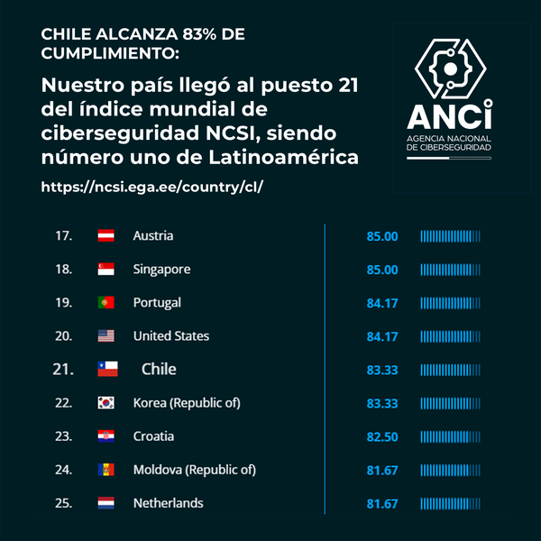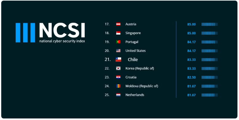 El índice, elaborado en Estonia, indica asimismo que Chile mantiene un sostenido incremento en su cumplimiento de diversos factores en ciberseguridad, llegando hoy a un 83,3%, contra 60% hace un año.